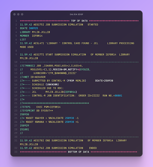 Acá entra el Simulador de Control M, un utilitario que permite submitir un JCL para que Control M simule su ejecución... ¿Qué ganamos con esto? El uso de variables propias de Control M como ODATE o funciones de fecha como CALCDATE.